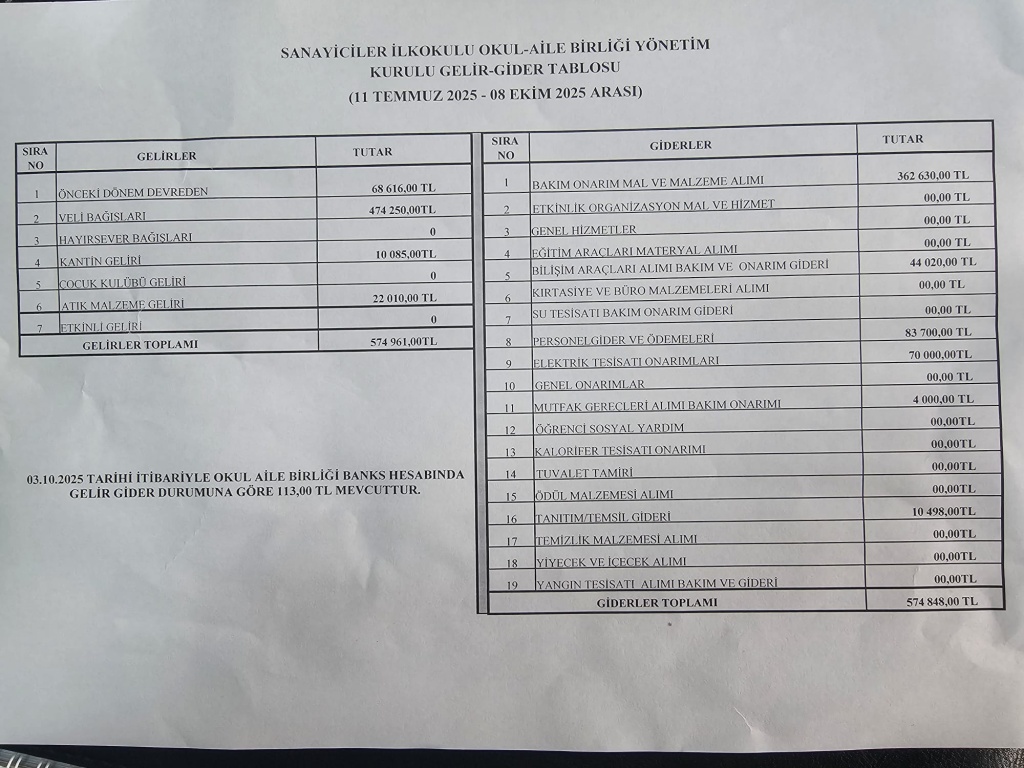 Sanayiciler İlkokulu Okul Aile Birliği Yönetim Kurulu'nun 11.07.2025 - 08.10.2025 tarihleri arasındaki gelir ve giderlerini gösteren tabloyu kıymetli velilerimize sunarız.